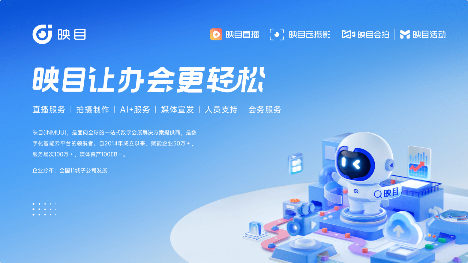 映目(英文名:INMUU)是中國領先的MICE(會議會展、活動、旅游獎勵)行業(yè)軟件及線下全案服務解決方案提供商,是國家高新技術企業(yè)和專精特新企業(yè),公司成立于2014年5月,在全國設立了12家公司及網點,服務覆蓋全國300+城市、海外20+區(qū)域及國家。映目為用戶提供會議活動領域的全鏈SaaS產品和全域線下服務及AI+智能體服務,有效提升用戶辦會效率和服務質量,已賦能全球100萬+客戶,影響全球6億終端用戶。